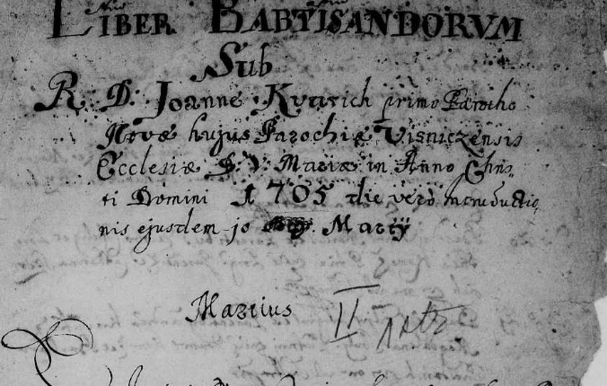 Na slici je prva stranica Matice krštenih župe Višnjica na kojoj piše ime prvog višnjičkog župnika i kad je uveden u službu.